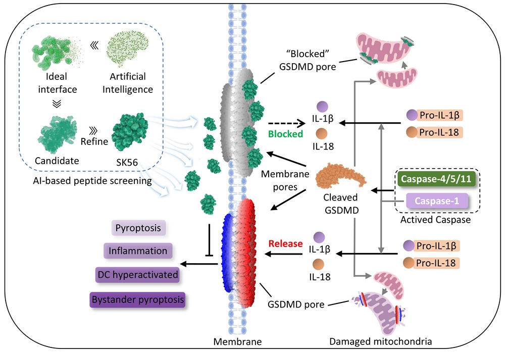 图 多肽SK56调控GSDMD-NT成熟孔活性的模式图