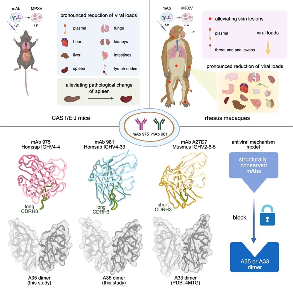 猴痘(mpox)疫情波及全球,严重威胁了公共卫生安全,世界卫生组织两度宣布其为国际关注的突发公共卫生事件。猴痘病毒包膜粒子(EV)上表达的A35蛋白对于病毒在宿主内细胞间传播至关重要,有潜力成为抗病毒药物的有效靶标。已有研究进展表明,靶向猴痘病毒A35或痘苗病毒同源蛋白A33的抗体可以不同程度地保护小鼠抵抗痘病毒感染。随着抗猴痘病毒单克隆抗体研究的不断深入,抗体在非人灵长类动物模型中的保护效果仍缺乏相关数据,抗体识别抗原的分子间作用机制同样有待进一步阐明。