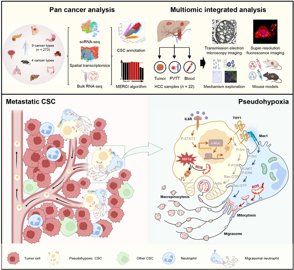 肿瘤转移的发生不仅依赖肿瘤细胞内在的遗传与表观遗传改变,也高度依赖肿瘤微环境中免疫细胞的调控。近年来,中性粒细胞在肿瘤转移中的功能逐渐受到关注,但其是否能够通过代谢性调控直接塑造肿瘤干细胞(Cancer stem cells, CSCs)的命运与状态,尚未得到系统阐明。该研究整合人类肿瘤单细胞转录组、空间转录组及泛癌分析数据,鉴定出一类具有显著转移优势的肿瘤干细胞亚群——THY1⁺ CSC。不同于经典HIF依赖的低氧反应,该亚群表现出一种非缺氧条件下形成的“伪缺氧”(pseudohypoxia)状态,并与远处转移密切相关。机制研究发现,在IL-6–Myc信号轴调控下,部分EpCAM⁺ CSC可向THY1⁺ CSC极化。更为重要的是,THY1⁺ CSC通过THY1–Mac1相互作用与肿瘤浸润中性粒细胞形成特异性通讯,诱导中性粒细胞以迁移体(migrasome)形式排出富含活性氧的损伤线粒体。随后,THY1⁺ CSC通过THY1介导的巨胞饮作用内化这些线粒体,从而在非低氧环境下建立稳定的伪缺氧代谢状态,增强侵袭与转移能力。功能实验进一步证实,阻断THY1–Mac1信号轴或抑制巨胞饮作用,均可显著削弱该伪缺氧状态及其介导的转移过程。