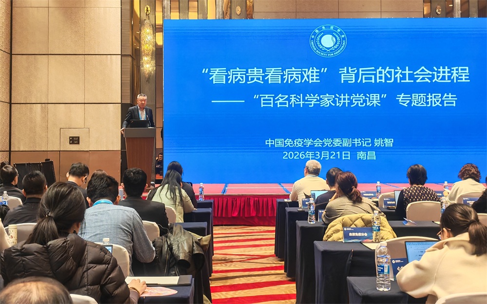 3月21日上午,会议正式开幕。中国免疫学会党委副书记、副理事长姚智教授作专题党课报告,题为:“看病贵、看病难”背后的社会进程。