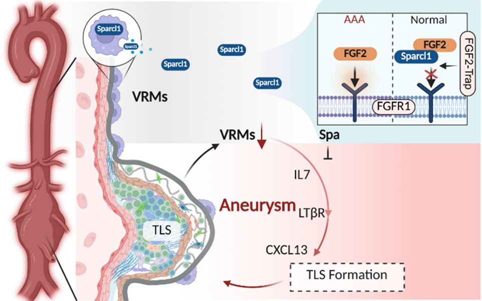 综上,该研究系统阐明了血管外膜组织原位巨噬细胞来源的Sparcl1在动脉瘤中的保护作用,揭示了其通过抑制FGF2驱动的病理性淋巴管生成和三级淋巴样结构形成的分子机制,并开发了具有临床应用前景的治疗性多肽Spa17。