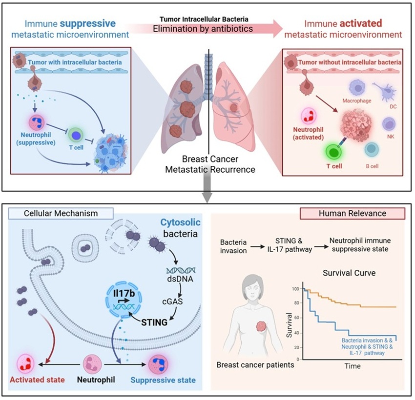 针对这一关键的科学问题,蔡尚团队通过建立严格的胞内菌研究模型,清晰区分胞内菌与胞外菌,并结合单细胞组学与临床前转移复发模型,探讨了同种细菌在胞外与胞内两种情况下的不同生理意义。研究表明,位于肿瘤细胞内的细菌(胞内菌)可通过激活癌细胞自身的cGAS–STING–IL17B信号通路,诱导中性粒细胞进入免疫抑制状态,从而塑造免疫抑制性微环境,促进转移灶的长期存活与复发;相比之下,位于肿瘤细胞外的细菌(胞外菌)则能够诱导具有抗肿瘤功能的中性粒细胞亚群,激活免疫应答,进而抑制肿瘤复发。