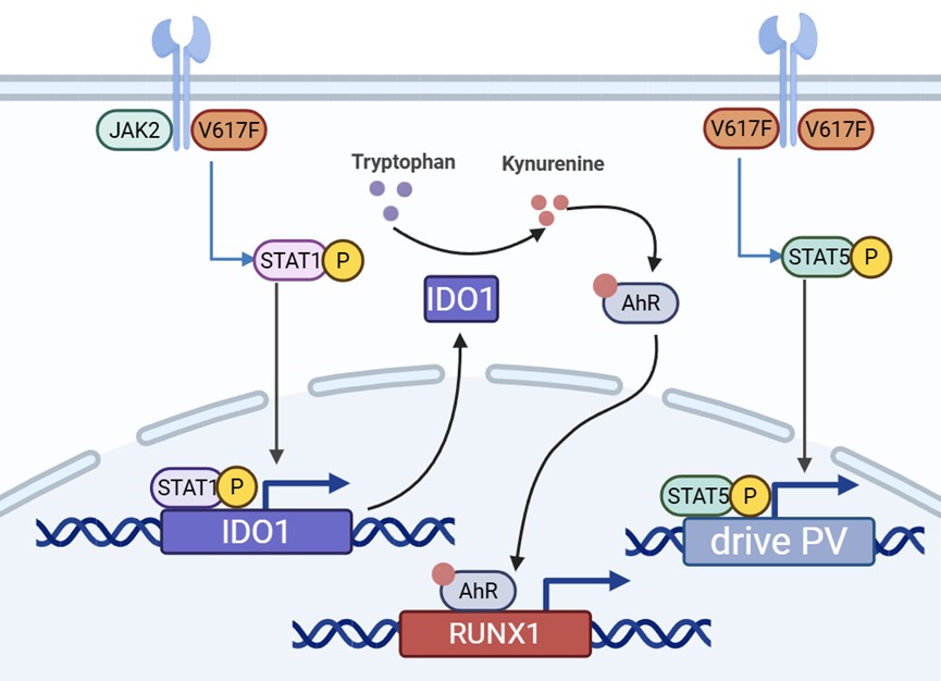 这一精巧机制的发现源于团队对临床现象的深入观察。在研究晚期肿瘤患者血小板增多的过程中,团队发现患者血清中犬尿氨酸(Kyn)水平显著升高,并通过激活AhR-RUNX1信号促使MEP向巨核细胞分化(Nat Immunol. 2023;24:2042-52)。在ET患者中,JAK2V617F的突变导致JAK-STAT信号通路活化,而先前的研究表明IFN-γ可以通过激活JAK-STAT信号诱导产生Kyn的关键代谢酶IDO1上调表达(Cancer Cell. 2018;33:480-94)。基于这一发现,团队对JAK2V617F突变的ET和PV患者骨髓样本进行系统分析,证实了在ET患者中,突变的JAK2通过激活STAT1信号上调IDO1表达,促进内源性Kyn产生,进而激活AhR信号通路。此外,研究还发现激活的AhR通过COX2-TXA2通路增强血小板活性,这解释了ET患者为何具有更高的血栓形成风险。