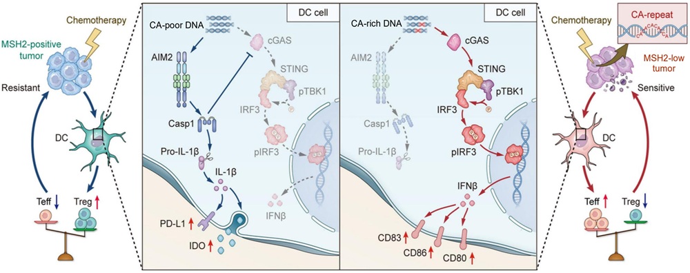 进一步的机制研究发现,CA-rich DNA 与cGAS形成新的结合位点,两者高亲和力互作诱导液–液相分离形成生物分子凝聚体,从而抑制了DNA与免疫抑制型感受器AIM2的互作。通过这一分子互作模式的精准调控,一方面促进了cGAS–STING 信号通路的高度激活,促发 I 型干扰素效应,从而诱导树突状细胞成熟并增强 CD8⁺ T 细胞的活化与浸润;另一方面,CA-rich DNA 与AIM2结合受限抑制了炎症小体的激活,从而抑制了 PD-L1、IDO 等免疫抑制分子上调;综合以上效应,化疗后CA-rich DNA富集程度高的肿瘤表现出显著的免疫激活表型。这一“CA-rich 与 CA-poor DNA 双通路决定免疫命运”的发现揭示了化疗后免疫效应差异的分子基础。