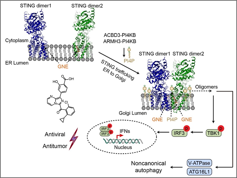 近日,清华大学药学院张从刚课题组、刘翔宇课题组联合陆军军医大学陆军特色医学中心陈客宏团队,在《Immunity》发表研究论文“A chemical agonist and the Golgi-resident lipid PI4P activate STING by inducing transmembrane helix rearrangement”。该研究系统揭示了一种全新的STING激活机制,并鉴定出新型STING激动剂 GNE-6468,为抗病毒和抗肿瘤免疫治疗提供了新的分子工具与潜在药物先导。