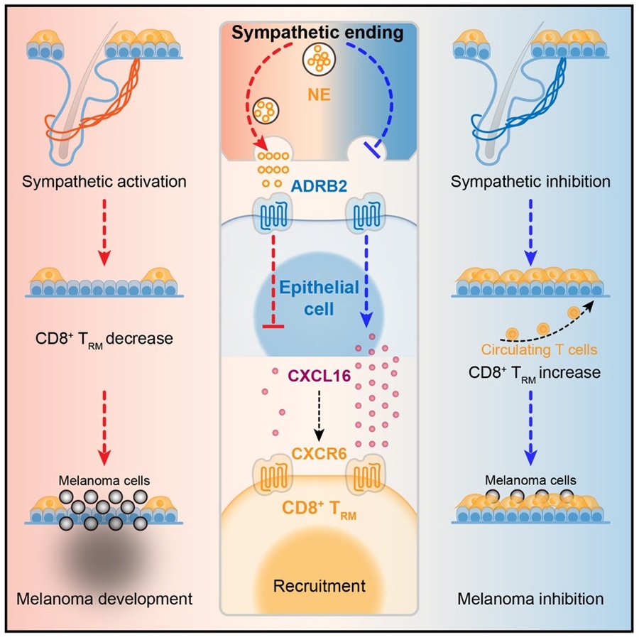 皮肤作为机体重要的屏障组织,由上皮细胞构成物理防线,并依赖免疫细胞维持持续的免疫监视。其中,CD8⁺ TRM长期驻留于上皮组织,在感染或肿瘤发生早期能够迅速启动免疫应答,是局部免疫防御的关键效应细胞。然而,在精神压力、生理状态变化或外界环境波动等情况下,皮肤免疫监视强度会发生动态改变,其背后的调控机制仍不清晰。