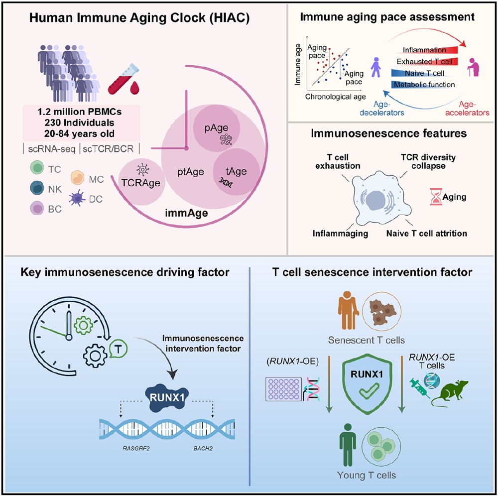 2026年4月14日,国家生物信息中心张维绮研究员、中国科学院动物研究所刘光慧研究员、温州医科大学附属衢州医院张峰研究员、国家生物信息中心蒋岚研究员、国家生物信息中心杨运桂研究员与中国科学院动物研究所曲静研究员合作,在《Immunity》期刊发表题为“Human immune aging clock identifies RUNX1 as a decelerator of T cell senescence”的研究论文。该研究构建了高精度人类免疫衰老时钟(HIAC),系统解析了免疫衰老的多尺度动态变化,发现转录因子RUNX1是T细胞衰老的功能性“刹车”,并在人免疫细胞及人源化小鼠模型中证明,过表达RUNX1可逆转T细胞衰老。这项研究形成了从定量评估到因果干预的证据链,将免疫衰老研究推进至可量化、可建模、可靶向的阶段。