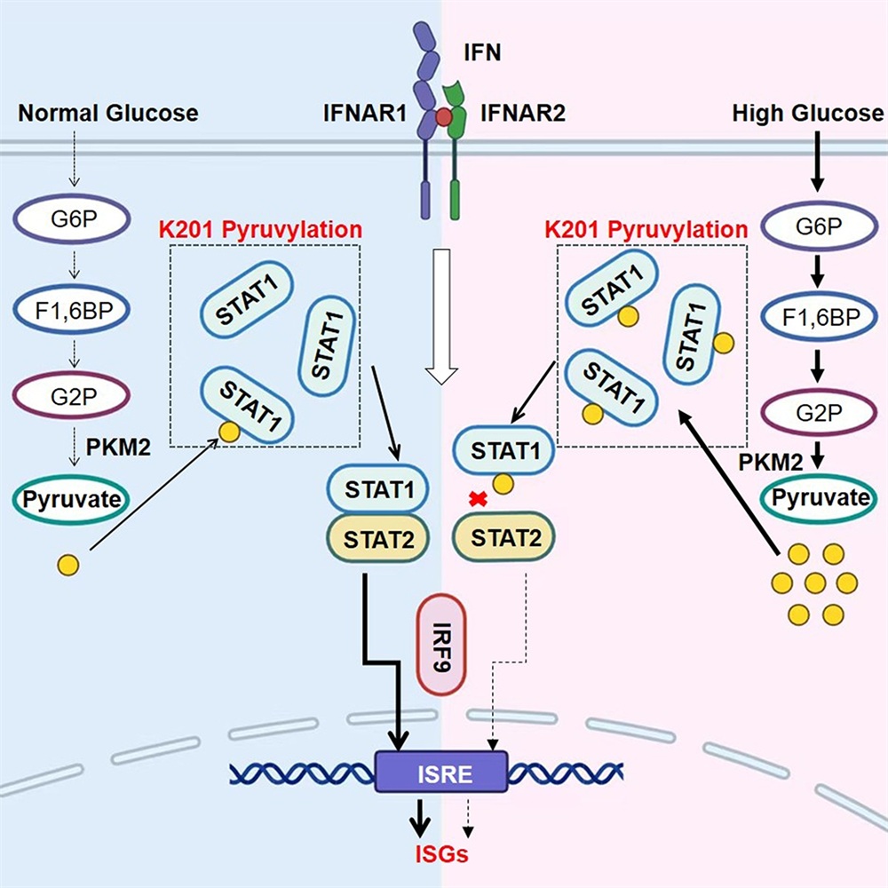 2026年2月27日,四川省医学科学院・四川省人民医院、电子科技大学医学院郑慧教授团队在Cell杂志发表题为“Pyruvate is a natural suppressor of interferon signaling by inducing STAT1 protein pyruvylation”的研究论文。该研究首次鉴定了一种新型蛋白翻译后修饰——蛋白丙酮酸化修饰(protein pyruvylation),并深入阐明了STAT1丙酮酸化修饰抑制I型干扰素(IFN-I)抗病毒免疫的分子机制,从而揭示了高血糖人群抗病毒免疫力降低以及血糖高的乙肝患者干扰素治疗不敏感的重要机理,为代谢-免疫交叉领域与临床感染防控开辟了一个新方向。