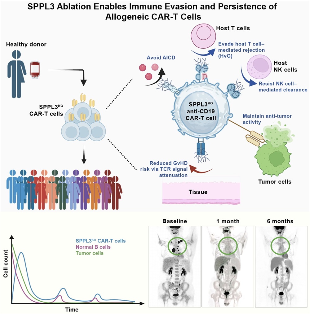 Building on these findings, the investigators launched an investigator-initiated clinical trial (IIT) to assess the clinical feasibility of this strategy. In early studies, SPPL3 and TCR were simultaneously disrupted to avoid GvHD; however, this approach resulted in limited persistence in vivo, suggesting that preserving the endogenous TCR is essential for the long-term T-cell survival. In subsequent clinical testing, the team modified the strategy by knocking out SPPL3 while preserving TCR expression. The clinical outcomes showed that these engineered CAR-T cells persisted for more than six months without inducing classical GvHD or severe immune-related toxicities, and several patients achieved durable clinical responses. These results demonstrate that the combination of SPPL3 knockout with TCR preservation offers a viable and effective approach to improving the persistence and safety of allogeneic CAR-T therapies.